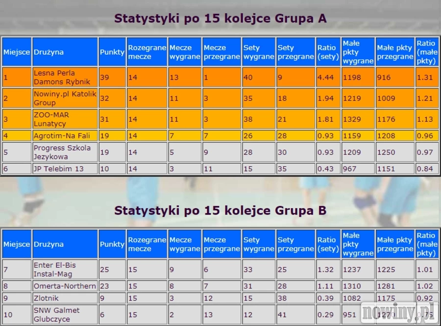 Drużyny raciborskiej ligi piłki siatkowej rozegrały piętnastą kolejkę spotkań i zakończyły rundę rewanżową tegorocznych rozgrywek. Złotnik pokonał 3:2 SNW Galmet Głubczyce, a Omerta Northern również po pięciosetowym pojedynku ograła 3:2 Enter El-Bis Instal Mag. W lidze kobiet Volleyball Sisters pokonał po szybkim meczu PV Volley Krapkowice 3:0, a w drugim meczu padł walkower dla drużyny CKZiU Nr 1 Inbras Lejdis.